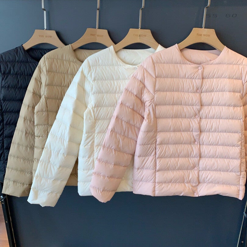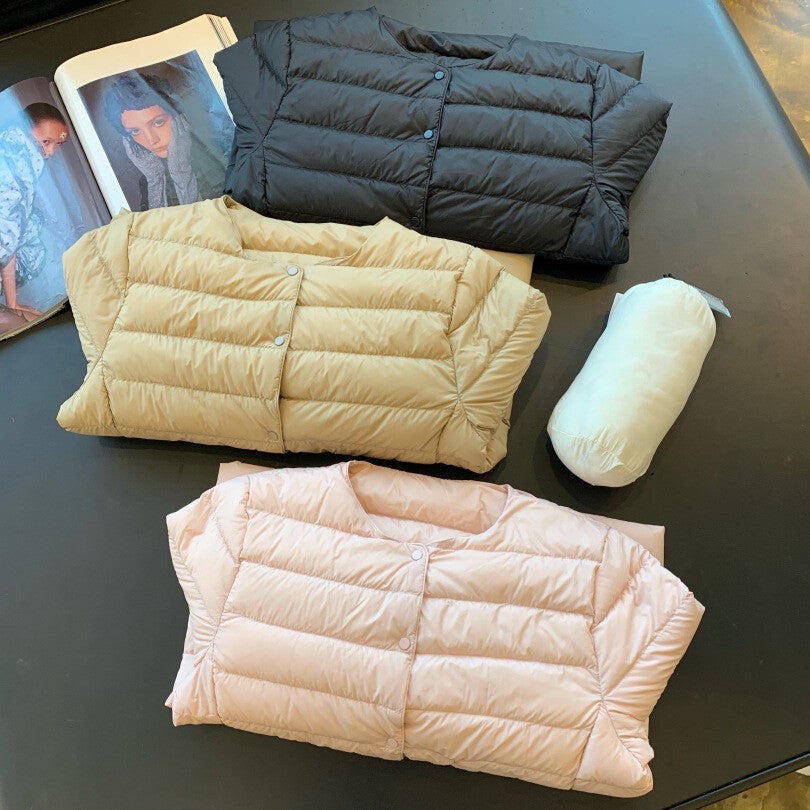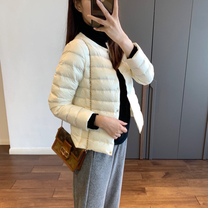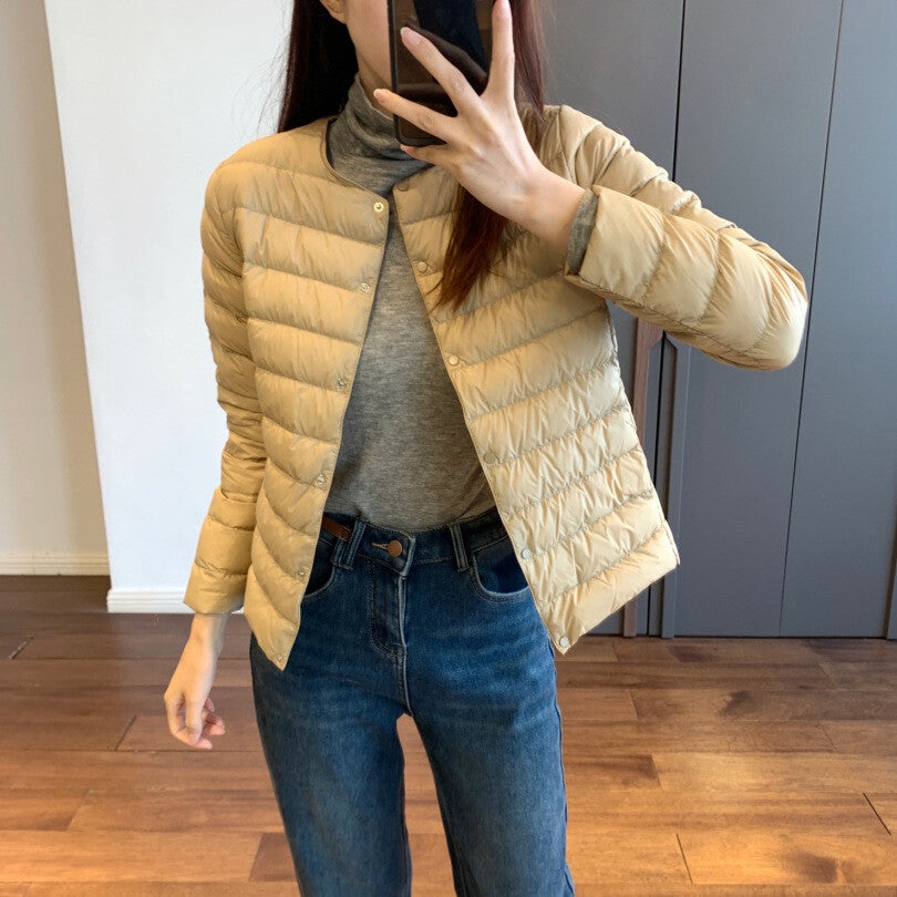 Diese leichte Daunenjacke ist die perfekte Begleitung für die kühleren Herbsttage und kombiniert Funktionalität mit stilvollem Design. Hergestellt aus 95% hochwertigen weißen Gänsedaunen, bietet sie nicht nur hervorragende Wärmeisolierung, sondern auch ein angenehmes Tragegefühl dank des weichen Samtmaterials. Die Jacke verfügt über ein innovatives, verstecktes Knopfdesign am Kragen, das es ermöglicht, zwischen einem klassischen Rundhalsausschnitt und einem eleganten V-Ausschnitt zu wählen. Diese Vielseitigkeit macht die Jacke zu einem idealen Kleidungsstück für verschiedene Anlässe, da sie sich leicht an unterschiedliche Outfits anpassen lässt. Die Knöpfe sind in der gleichen Farbe wie der Stoff gehalten, was dem Gesamtbild eine harmonische Note verleiht. Erhältlich in den Farben Weiß, Schwarz, Khaki und Rosa, ist diese kurze Damenjacke nicht nur funktional, sondern auch ein modisches Statement, das in keiner Herbstgarderobe fehlen sollte.