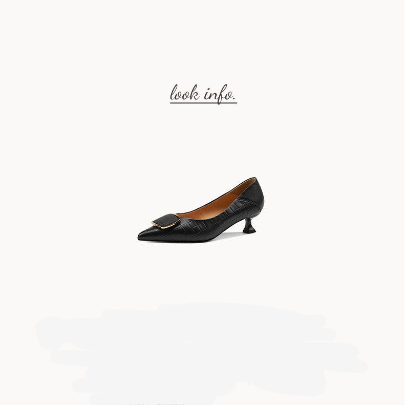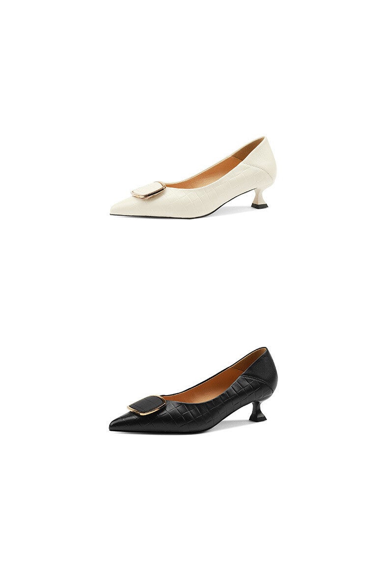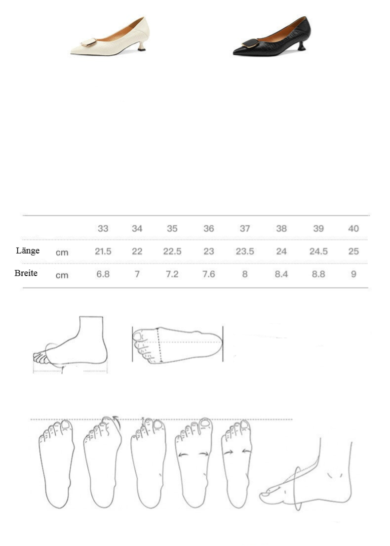 Entdecken Sie die perfekten Stiletto Schuhe aus echtem Leder für Damen, die Stil und Komfort vereinen. Diese vielseitigen Schuhe sind aus hochwertigem, weichem Leder gefertigt und bieten Ihnen die Möglichkeit, lange Zeit auf den Beinen zu stehen, ohne Ermüdung zu verspüren. Mit einem mittelhohen Absatz von 3-5 cm und einer eleganten Stiletto-Fersenform verleihen sie jedem Outfit eine raffinierte Note. Die ansprechende Metall-Schnalle und die sorgfältig gestalteten Karo-Nähte setzen zusätzliche Akzente und machen diese Schuhe zu einem echten Blickfang. Die Gummisohle sorgt für optimalen Halt und Flexibilität, während die Einlegesohle aus Rindsleder für zusätzlichen Komfort sorgt. Erhältlich in den klassischen Farben Schwarz und Beige, passen diese Schuhe perfekt zu jeder Garderobe und sind in den Größen 34 bis 40 erhältlich. Gönnen Sie sich den Luxus und die Eleganz dieser Stiletto Schuhe und heben Sie Ihren Look auf ein neues Level!