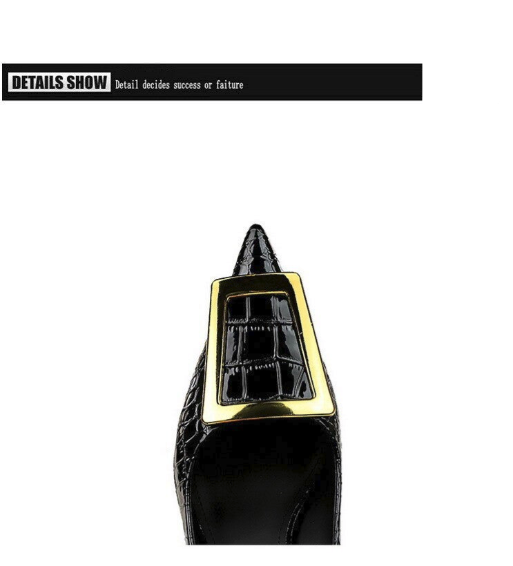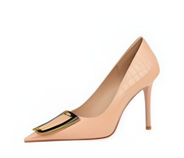 modische, schlankmachende Stilettos, hohe Absätze, flacher Mund, spitze Zehenpartie, Metallschnalle