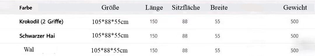 Entdecken Sie die aufregende Schwimmmatte mit Sitzfunktion, die nicht nur für unvergessliche Wasserspaßmomente sorgt, sondern auch durch ihre Sicherheitsgriffe zusätzlichen Halt bietet. Diese aufblasbare Schwimmmatte ist in drei fantastischen Varianten erhältlich: dem majestätischen Schwarzhai (Orca), dem sanften Blauwal und dem abenteuerlichen Krokodil. Mit einer großzügigen Größe von 150 x 88 x 55 cm bietet sie ausreichend Platz für Kinder und Erwachsene, um sich entspannt im Wasser zu treiben. Hergestellt aus umweltfreundlichem PVC, ist die Matte nicht nur langlebig, sondern auch sicher für die ganze Familie. Genießen Sie die Sonne und das Wasser mit einem Produkt, das sowohl Spaß als auch Sicherheit vereint – perfekt für den nächsten Strandtag oder den Poolbesuch!
