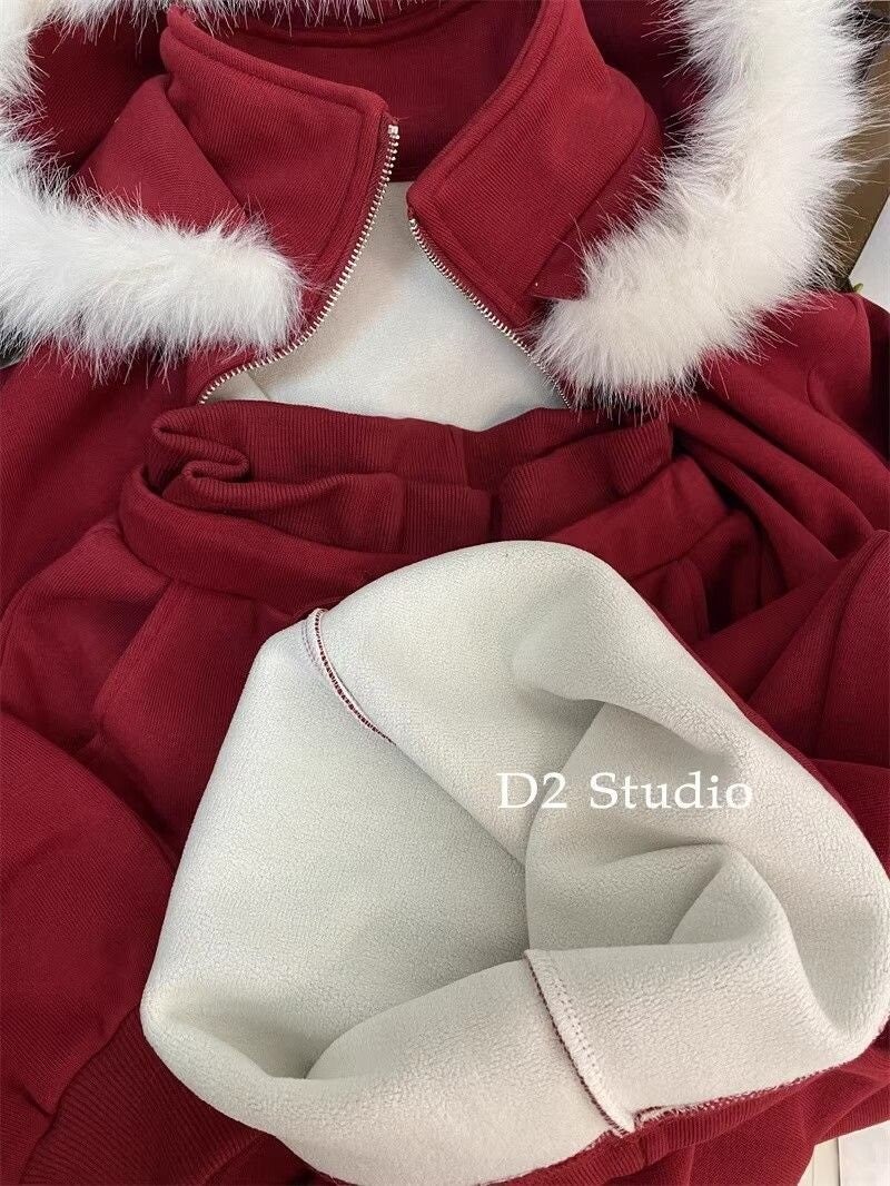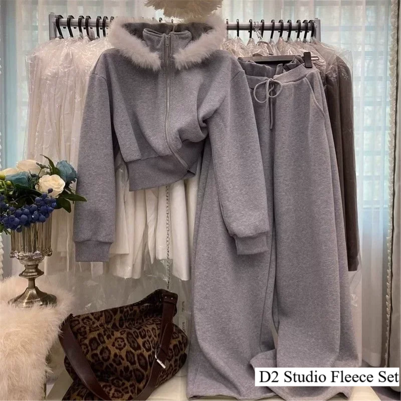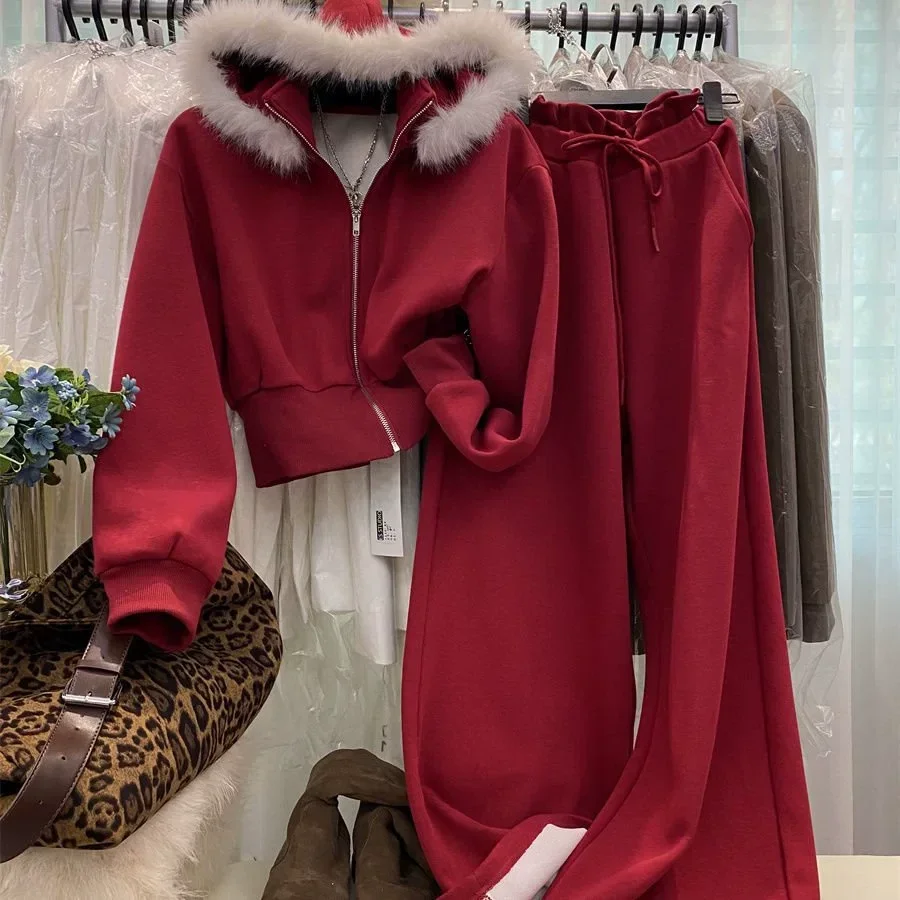 Fleece-Sweatshirt Damenset, Herbst/Winter, mit Pelzkragen, Kapuzen-Reißverschluss-Jacke und Weitgeschnittene Hose, 2-teilig