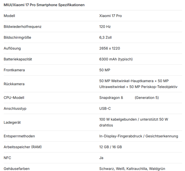 Modell Xiaomi 17 Pro