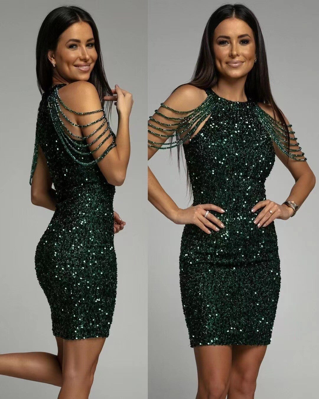 Sexy trägerloses Glitzerschuppen-Fransen-Kleid mit Kristallbesatz