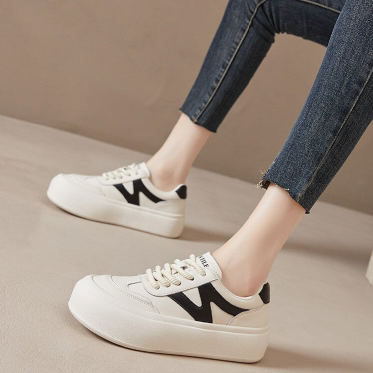 Damen Sneaker aus echtem Leder, mit dicker Plateau-Sohle, runder Zehenpartie, leicht und modisch – Freizeitschuhe